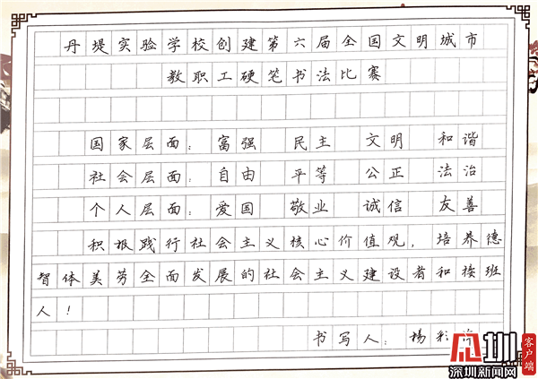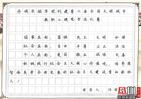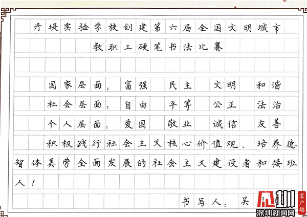 見圳客戶端·深圳新聞網(wǎng)10月29日訊(見圳客戶端、深圳新聞網(wǎng)記者 潘寶儀 通訊員 袁小俊 圖/朱雅琪 )  為落實立德樹人總目標(biāo)、培育和踐行社會主義核心價值觀,創(chuàng)建文明城市,積極倡導(dǎo)全校教職工勤練教學(xué)基本功,提高教師綜合素養(yǎng),豐富課余生活,展示丹堤實驗學(xué)校教職工風(fēng)采,學(xué)校于10月25日舉行了“創(chuàng)建第六屆全國文明城市教職工硬筆書法比賽”。