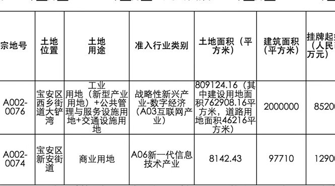 宗地出讓條件明確,競得人應嚴格按照土地用途和有關(guān)部門審定的規(guī)劃設(shè)計方案使用和開發(fā)建設(shè)。即A002-0076宗地競得人須在成交后與寶安區(qū)工業(yè)和信息化局簽訂《產(chǎn)業(yè)發(fā)展監(jiān)管協(xié)議》,A002-0074宗地競得人須在成交后與寶安區(qū)發(fā)展和改革局簽訂《產(chǎn)業(yè)發(fā)展監(jiān)管協(xié)議》。