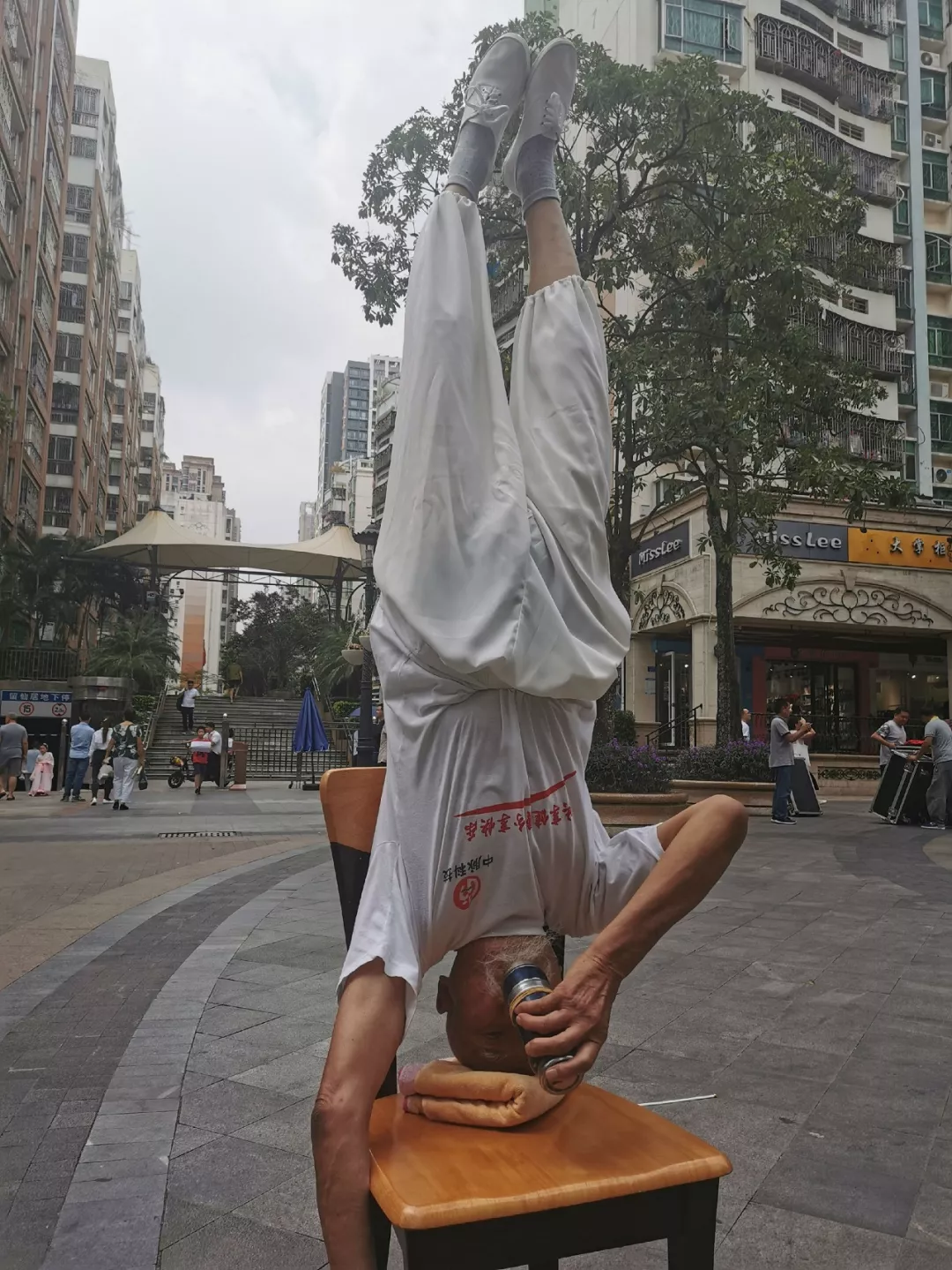 蛇口消息報(bào)2019年11月4日訊 頭著板凳倒立、雙手寫字、倒立喝水、倒立吊環(huán),倒立唱歌……做這些高難度動(dòng)作的人居然是一位85歲高齡的老人。