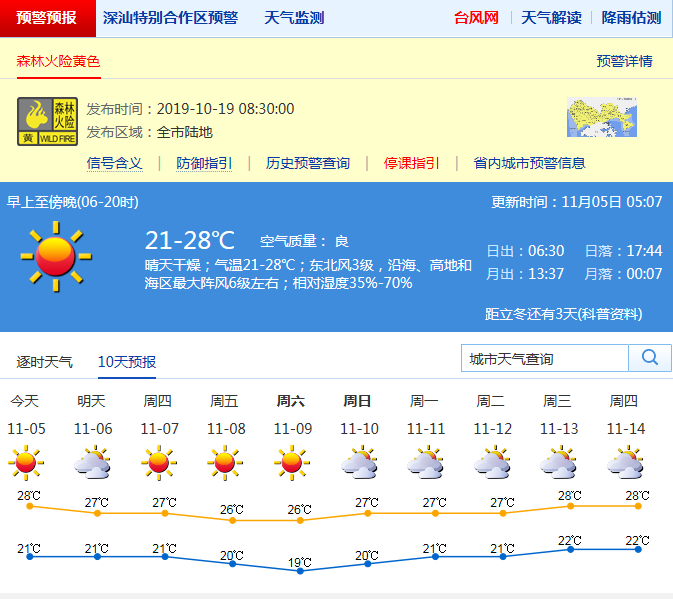 見圳客戶端·深圳新聞網(wǎng)2019年11月5日訊 深圳市氣象局預(yù)計5日晴天干燥;氣溫21-28℃;東北風(fēng)3級,陣風(fēng)6級;相對濕度45%-75% 。6-10日多云到晴天,空氣干燥,沿海、高地和海區(qū)最大陣風(fēng)可達7級左右,氣溫小幅波動,1字頭氣溫或?qū)⒃佻F(xiàn)。