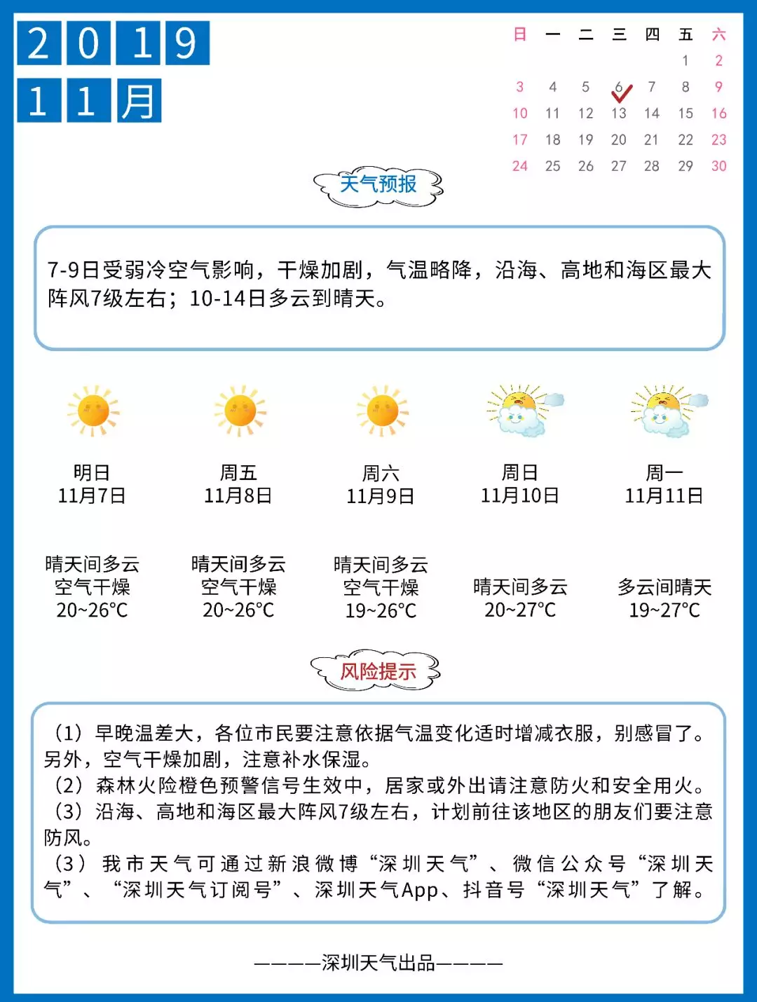 預(yù)計11月天氣較平穩(wěn),降水偏少,空氣干燥,早晚溫差較大。由于大氣擴散氣象條件較差,部分地區(qū)可能會出現(xiàn)灰霾天氣。雖然目前深圳的冷空氣,好像都不太給力,但是降溫這事誰說得準呢,所以,要注意增添衣物啊~