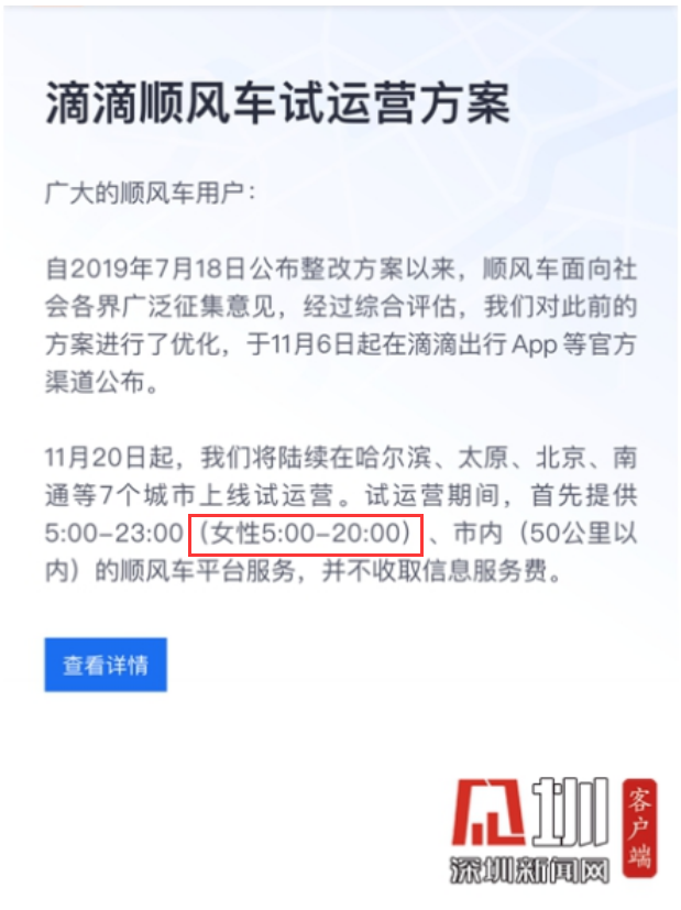 面對爭議,滴滴調整了:對所有順風車用戶提供服務的時間均改為5:00-20:00