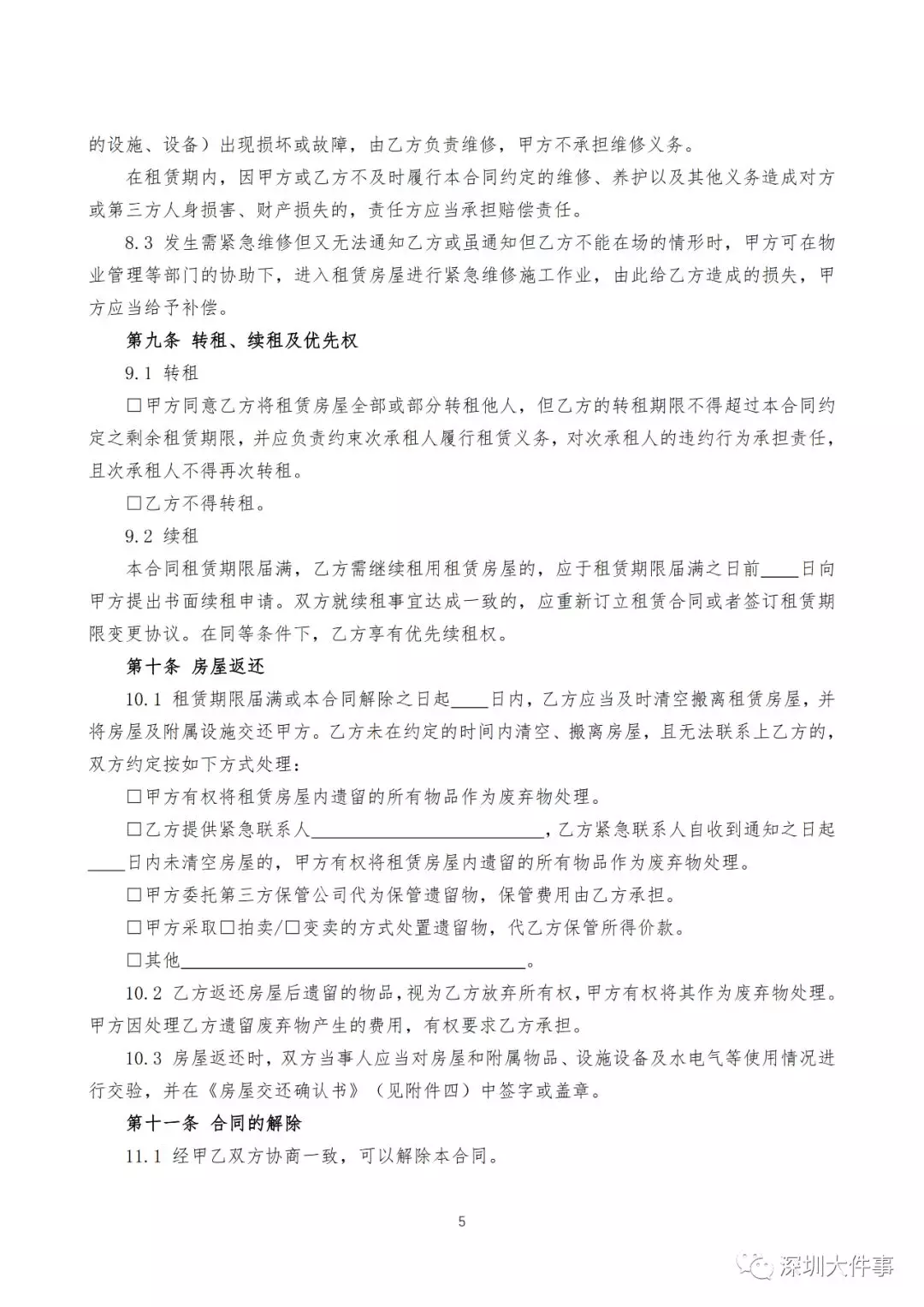 7、強(qiáng)化落實(shí)房屋安全主體責(zé)任,新版合同保留了舊版合同附件《深圳市房屋租賃安全管理責(zé)任書(shū)》,要求租賃雙方當(dāng)事人必須簽訂該責(zé)任書(shū),否則房屋租賃主管部門(mén)不受理合同登記備案。
