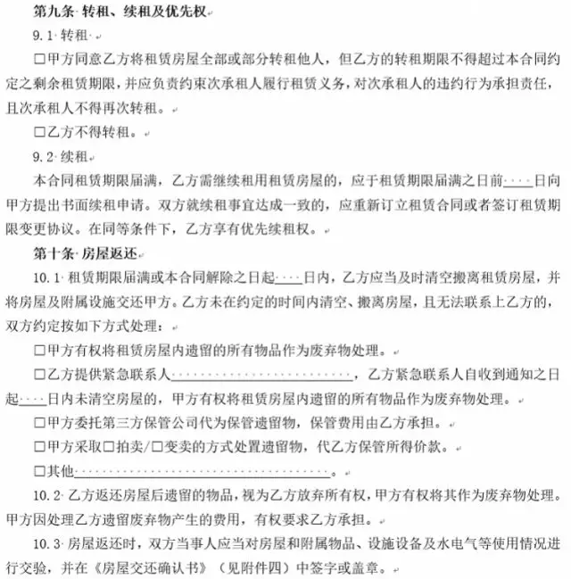 4、增設(shè)承租人下落不明時(shí),出租人對租賃房屋內(nèi)的遺留物處理?xiàng)l款。實(shí)踐中,存在很多承租人無力支付租金時(shí)斷絕與出租人聯(lián)系的情形。為解決出租人無法聯(lián)系承租人時(shí)對租賃房屋內(nèi)遺留物的處理問題,新版合同增設(shè)承租人未按約定交還房屋且下落不明時(shí)遺留物的處理?xiàng)l款,由雙方當(dāng)事人在簽訂合同時(shí)就此問題協(xié)商一致,避免出租人遭受無法收回房屋導(dǎo)致房屋使用價(jià)值無法實(shí)現(xiàn)的損失或者因自行處置遺留物引起糾紛、面臨侵權(quán)責(zé)任的風(fēng)險(xiǎn),有效解決承租人下落不明時(shí)租賃房屋內(nèi)遺留物的處理問題。