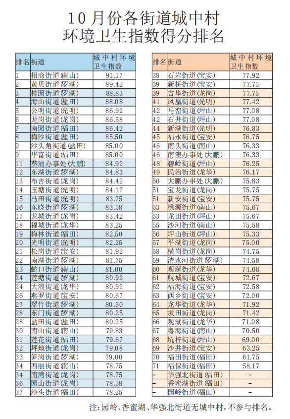 11月10日,深圳市城管和綜合執(zhí)法局同步發(fā)布了10月份城中村環(huán)境衛(wèi)生指數(shù)測評結(jié)果。10月份深圳市城中村環(huán)境衛(wèi)生指數(shù)較9月有所提升,雖有改善,但幅度不大,得分僅為77.92分,依舊是全市環(huán)境衛(wèi)生的最大短板。其中,招商街道以91.17分的高分摘取城中村環(huán)境衛(wèi)生指數(shù)排名桂冠。