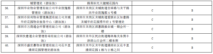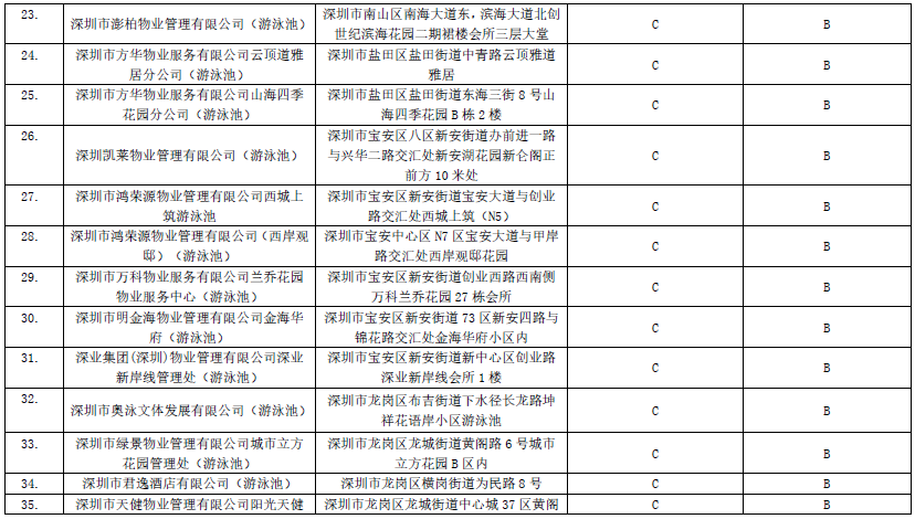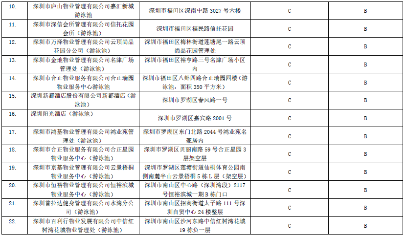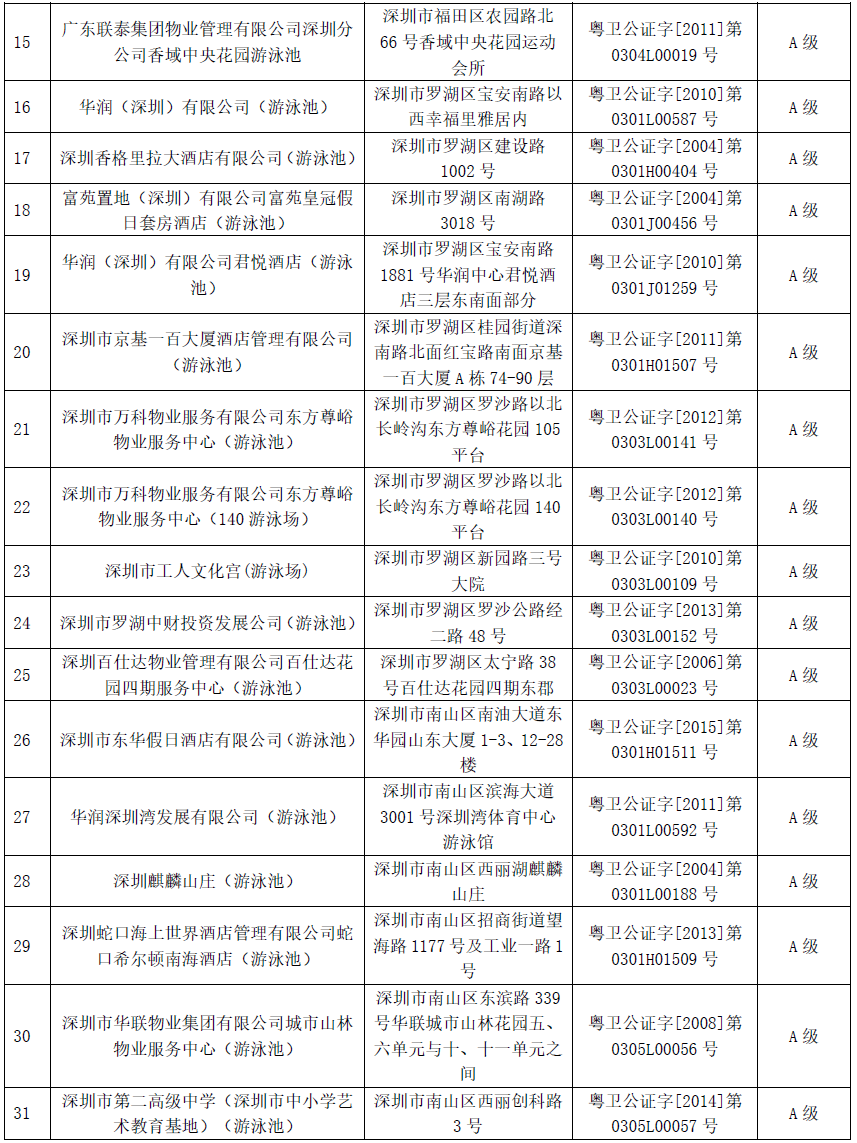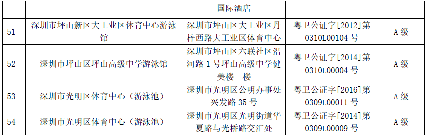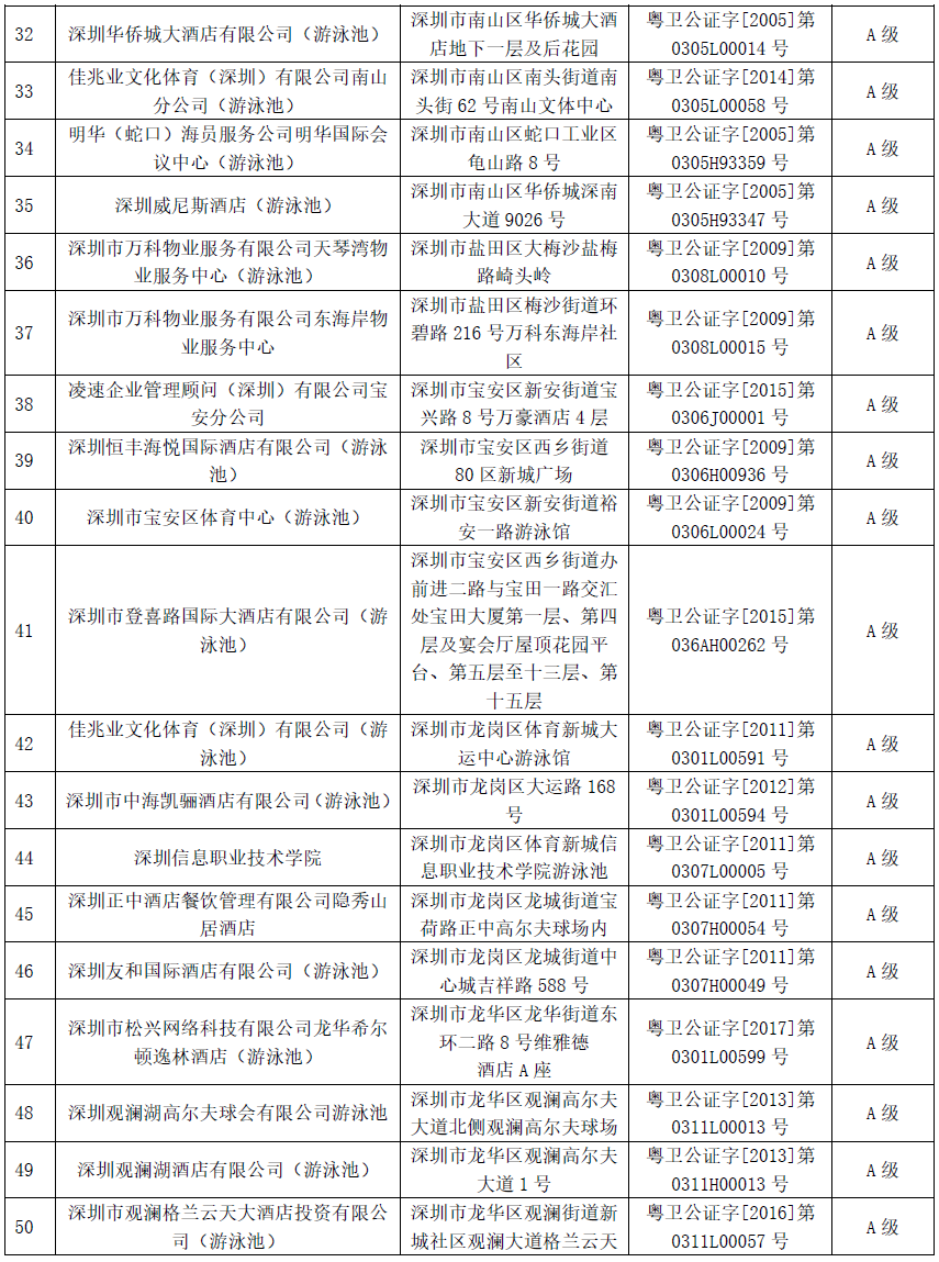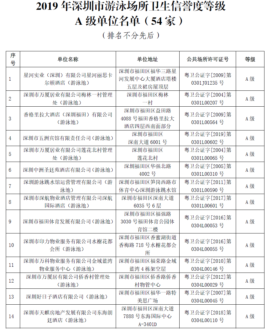 附:2019年深圳市游泳場所衛(wèi)生信譽(yù)度等級(jí)A級(jí)名單