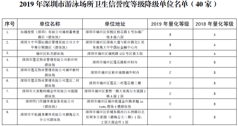 2019年深圳市游泳場所衛(wèi)生信譽(yù)度等級(jí)降級(jí)單位名單