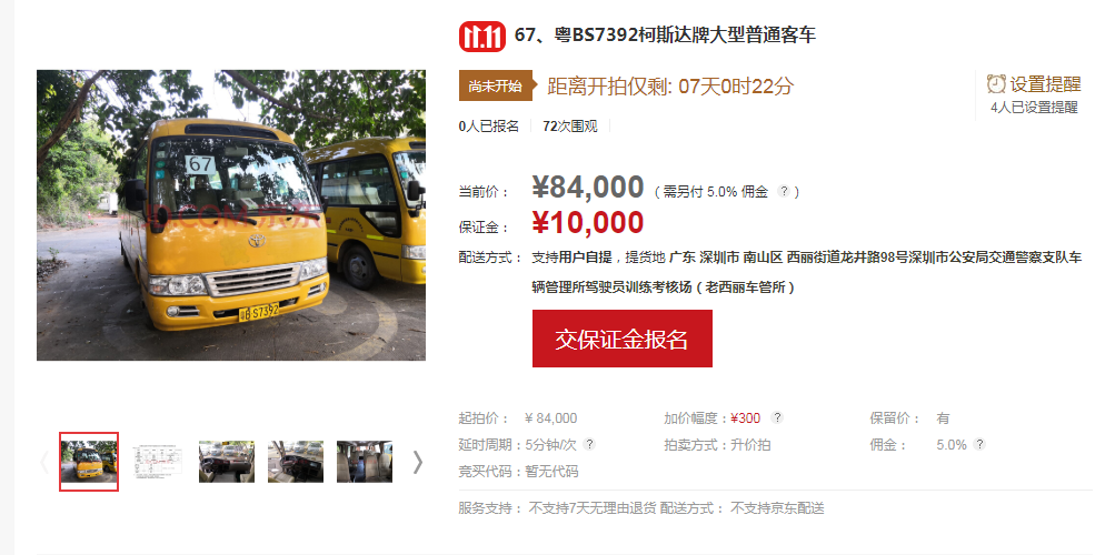 競買人應(yīng)于拍賣會前在京東拍賣平臺進(jìn)行實名登記注冊,注冊成功后請按京東拍賣平臺的提示進(jìn)行操作;競買人在對拍賣標(biāo)的物首次確認(rèn)出價競拍前,按系統(tǒng)提示報名繳納10000元/輛的保證金;在競價過程中,請競買人按規(guī)定的加價幅度300元出價,若自行出價,請仔細(xì)核對好出價金額,若出現(xiàn)出價金額錯誤的情況,由買受人自行承擔(dān)后果;拍賣成交后,買受人請于拍賣成交之時起72小時內(nèi)全額支付拍賣成交價款、拍賣傭金、增值稅及附加、機(jī)動車轉(zhuǎn)移登記車牌費,并到廣東華士德(深圳)拍賣行有限公司所在地(深圳市羅湖區(qū)中興路219號華興酒店4樓)簽署《拍賣成交確認(rèn)書》及辦理相關(guān)手續(xù)。