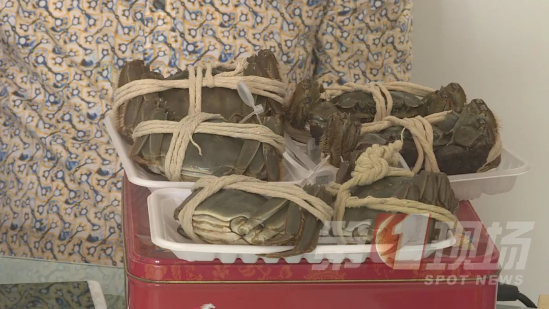 “蟹券上寫明母蟹175克,拿了兩只去稱重,帶上繩子的重量分別只有146克、156克,兩只大閘蟹都不足稱。