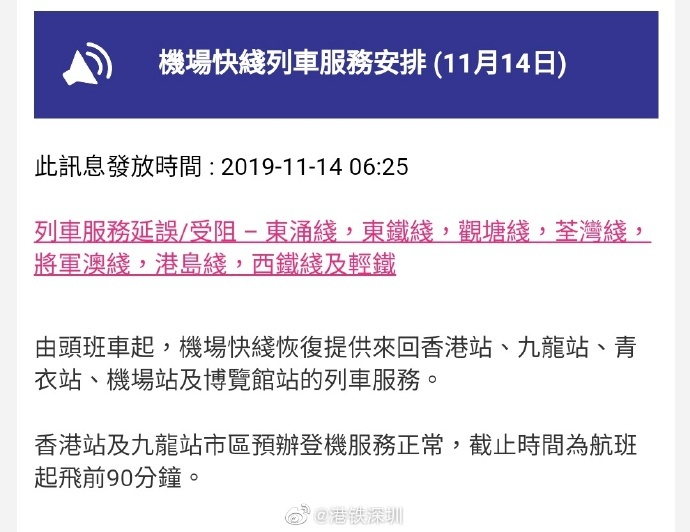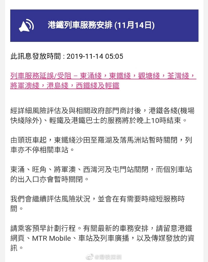 據港鐵官網目前最新消息,11月14日,港鐵各線(機場快線除外)、輕鐵及港鐵巴士的服務將于晚上10時結束,東涌線、東鐵線、觀塘線、荃灣線、將軍澳線、港島線、西鐵線及輕鐵列車服務延誤/受阻。
