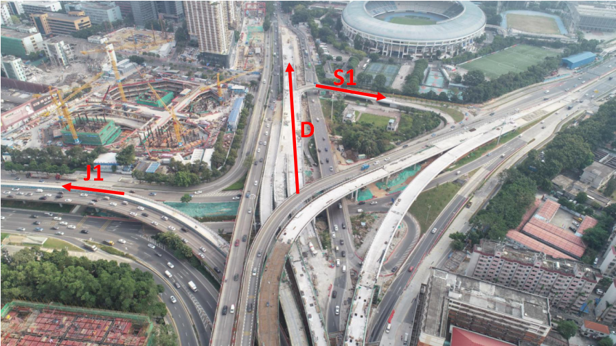 泥崗立交J1 (北環(huán)大道轉泥崗東路東行)匝道橋由三車道轉成四車道;泥崗立交D (北環(huán)大道轉上步北路南行)匝道橋由原來一條匝道橋新增至四條匝道橋,泥崗立交S1 (上步北路南行轉泥崗西路)匝道橋新增了兩條匝道橋, J1、D、S1匝道橋預計將于今年12月初開放通車。
