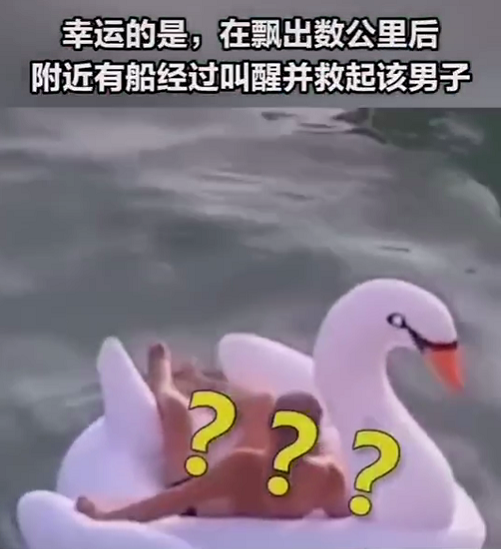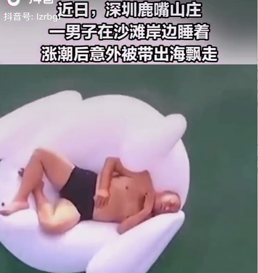 最近,有個視頻很火。視頻中標注:一男子在深圳鹿嘴山莊游玩時,躺在天鵝氣墊上睡著了,漲潮后被帶出海飄走,在飄出數公里后他被經過的船叫醒并救起。