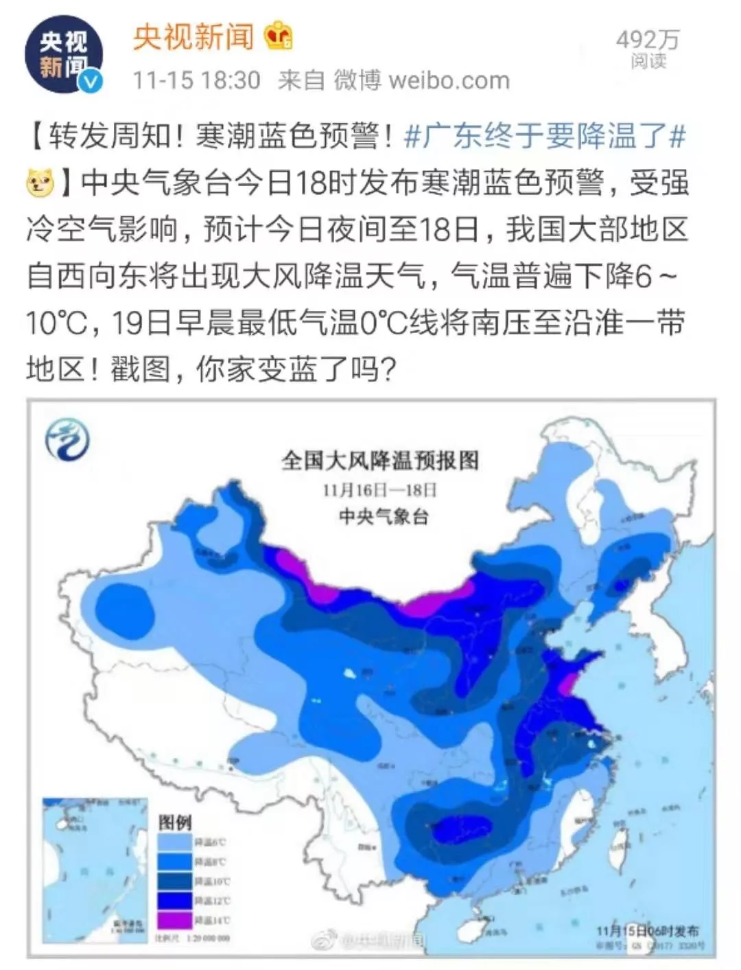 中央氣象臺于15號發(fā)布寒潮藍色預警!