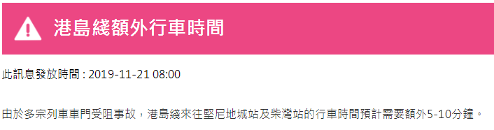 據(jù)港鐵消息,11月21日,香港地鐵各線(機(jī)場(chǎng)快線除外)、輕鐵及港鐵巴士的服務(wù)將于晚上11時(shí)結(jié)束。西鐵線/東鐵線紅磡站及大學(xué)站繼續(xù)關(guān)閉。需要注意的是,元朗站將于下午2時(shí)關(guān)閉,列車(chē)不停元朗站,此外,個(gè)別車(chē)站出入口會(huì)暫時(shí)關(guān)閉。