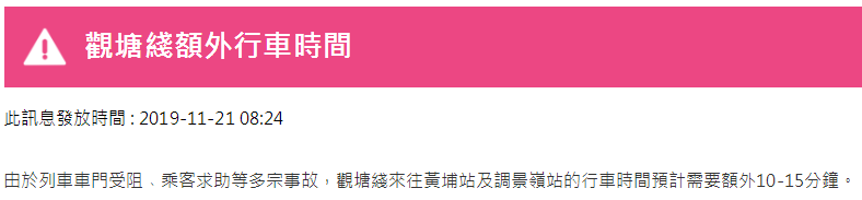 此外,目前,由于列車(chē)車(chē)門(mén)受阻,乘客求助等多宗事故,港島線來(lái)往堅(jiān)尼地城站及柴灣站、荃灣線來(lái)往中環(huán)站及荃灣站、觀塘線來(lái)往黃埔站及調(diào)景嶺站,行車(chē)時(shí)間預(yù)計(jì)需要額外10至15分鐘。
