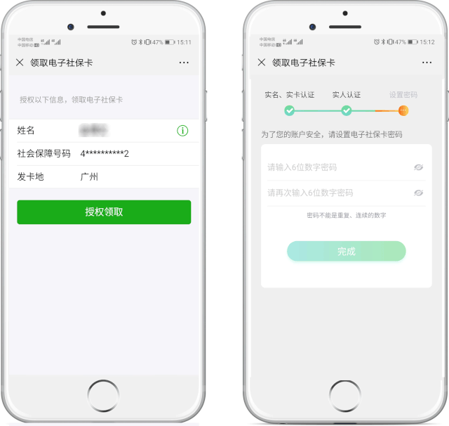 根據(jù)提示授權(quán)領(lǐng)取電子社???,并進(jìn)行實人實名認(rèn)證后,設(shè)置電子社??艽a,即可完成領(lǐng)取。