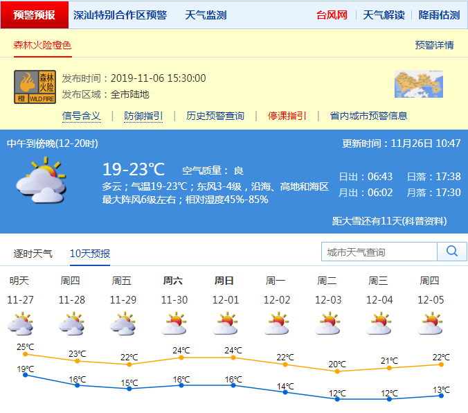 見圳客戶端·深圳新聞網(wǎng)2019年11月26日訊 記者從市氣象臺獲悉,26日多云,氣溫19-23℃;27日晴間多云,空氣干燥,早晚清涼,夜間新一股空氣開始影響我市。