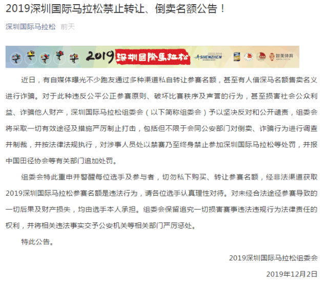 組委會重申,每位選手及參與者,切勿私下購買、轉讓參賽名額,經(jīng)非法渠道獲取2019深圳國際馬拉松參賽名額是違法行為,請各位選手認真理性對待。對未經(jīng)合法途徑參賽導致的一切后果及財產(chǎn)損失,均由選手本人承擔。