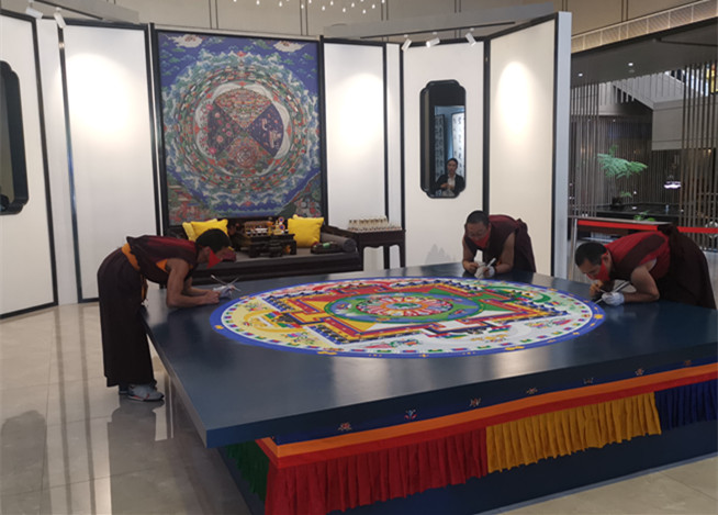 在活動現場,壇城沙畫的現場制作格外引人注目?!耙簧骋皇澜?,一葉一菩提”——壇城沙畫的過程仿佛一場視覺的盛宴。據了解,壇城是指對一座宮殿一個世界的泛義,用珍貴珊瑚、瑪瑙、綠松石等礦物質研磨成粉,落沙即成畫,畫面立體生動,壇城展示了高度的藝術魅力和視覺觀感。