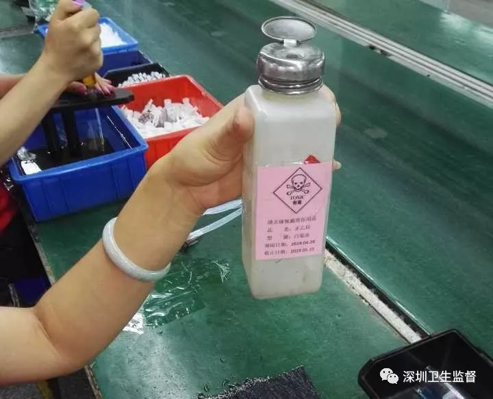 檢查過(guò)程中發(fā)現(xiàn)該公司A棟2樓水箱車間,可見(jiàn)組裝線組裝崗位工人韋某正在使用白電油(成分顯示為正己烷)作業(yè),未見(jiàn)佩戴防護(hù)指套。