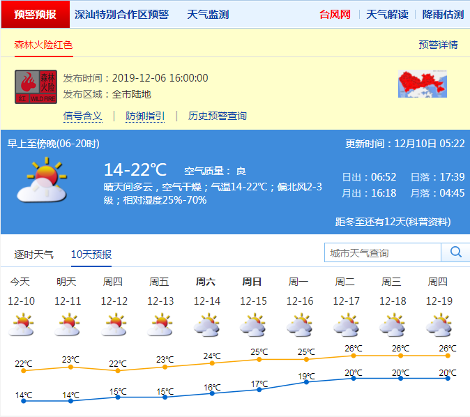 見(jiàn)圳客戶端·深圳新聞網(wǎng)2019年12月10日訊 今日深圳晴天間多云,空氣干燥;氣溫14-22℃;偏北風(fēng)2-3級(jí);相對(duì)濕度25%-70%。