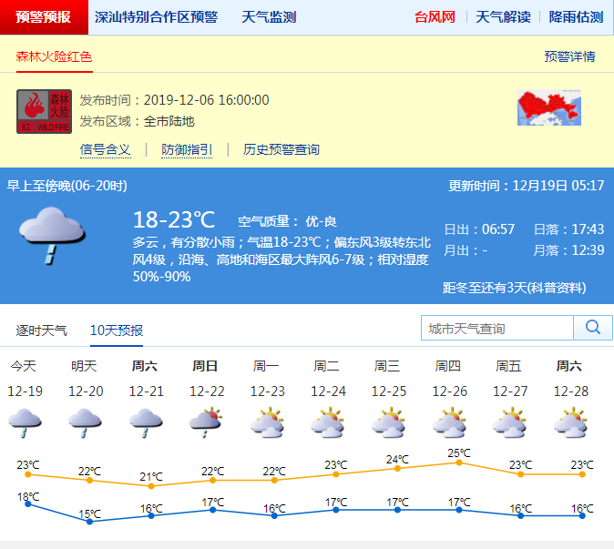 見圳客戶端·深圳新聞網(wǎng)2019年12月19日訊 深圳市氣象局預(yù)計18日夜間至21日冷空氣影響,轉(zhuǎn)陰天,有分散小雨,沿海、高地和海區(qū)陣風(fēng)6-7級,氣溫下降,20日最低氣溫15℃;22日午后轉(zhuǎn)多云,23-25日可見陽光,氣溫回升。