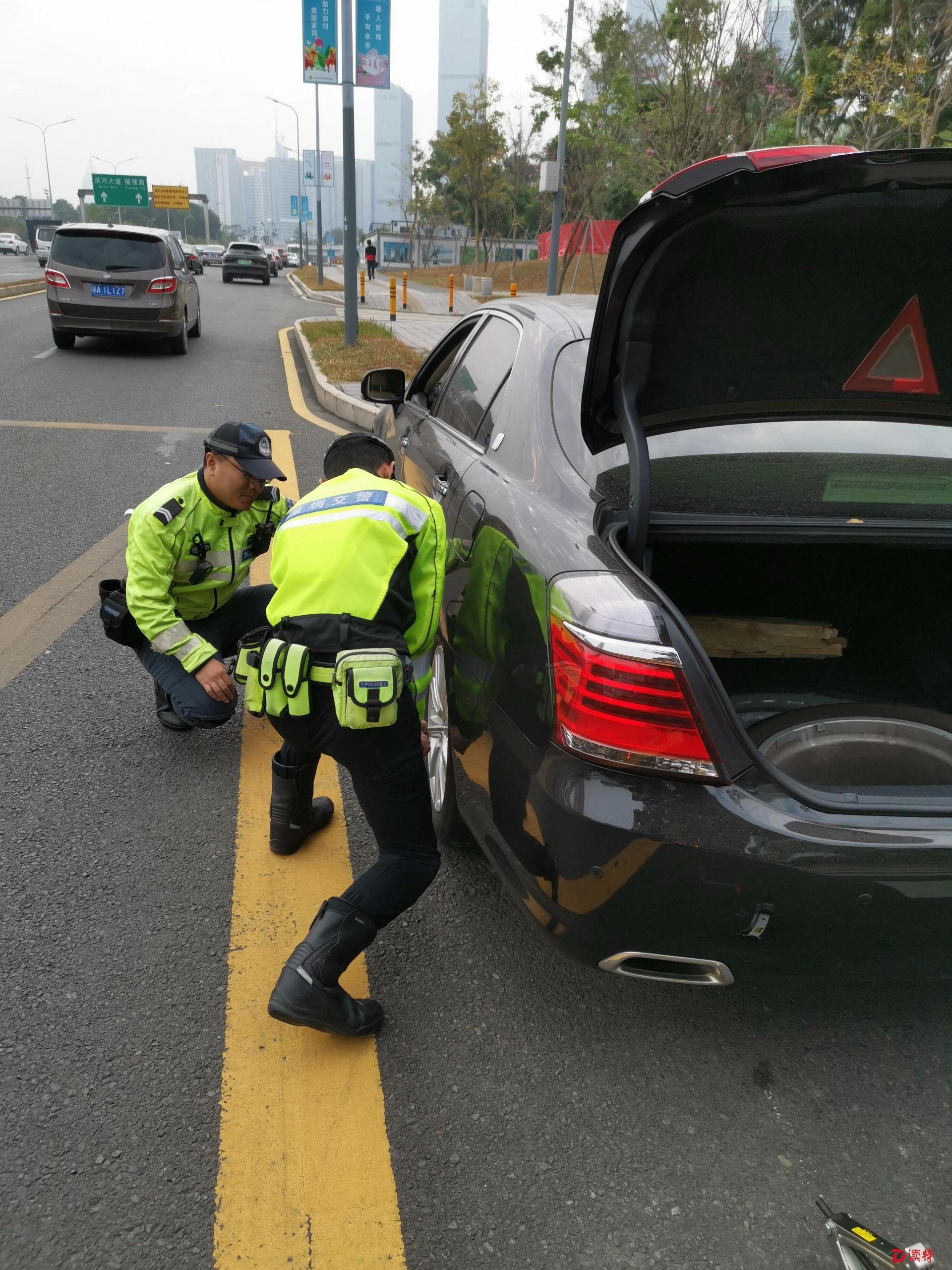 正當(dāng)記者心急如焚且束手無策之時,在路上巡查的福田交通大隊香蜜湖中隊鐵騎鄭彬銳警官途經(jīng)此地,見狀他立即停住鐵騎,上前詢問情況。當(dāng)他看到車輛左側(cè)兩輪均癟下時,立即問記者是否有備胎,同時讓記者趕緊聯(lián)系車行再送一個備胎過來。