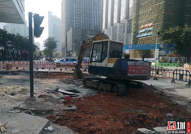 福田區(qū)福中三路和民田路的施工現(xiàn)場,道路被挖,一輛挖掘機停在道路上。