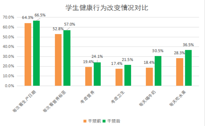 通過1學(xué)年的營養(yǎng)教育活動,評估發(fā)現(xiàn),學(xué)生選擇經(jīng)常吃的零食中,水果類排名第一,占69.6%;糖果類由26.6%明顯下降至19.9%,降幅25%。經(jīng)常喝的飲料依次是白開水、純牛奶酸奶、果汁和碳酸飲料,干預(yù)后白開水和牛奶比例分別提升至83.4%和76.7%,升幅均超過10%;果汁和碳酸飲料分別降低至38.9%和17.3%,尤其是碳酸飲料降幅超過了30%。每天喝牛奶的比例明顯提升至30.5%,升幅65.8%;每天吃水果的比例提升至36.5%,升幅達(dá)到36.5%。每天吃早餐的比例由67.8%上升至74%。