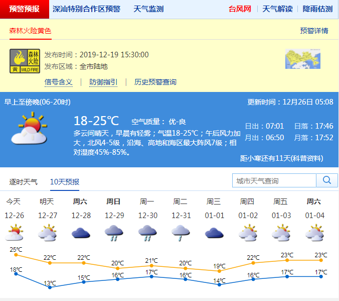 見圳客戶端·深圳新聞網(wǎng)2019年12月26日訊 今日白天多云,氣溫18-25℃,明天傍晚至27日受冷空氣影響,北風加大,沿海、高地和海區(qū)最大陣風7級左右,氣溫下降4-5℃,天氣轉(zhuǎn)涼。28日多云,29-30日有一次明顯降雨過程。