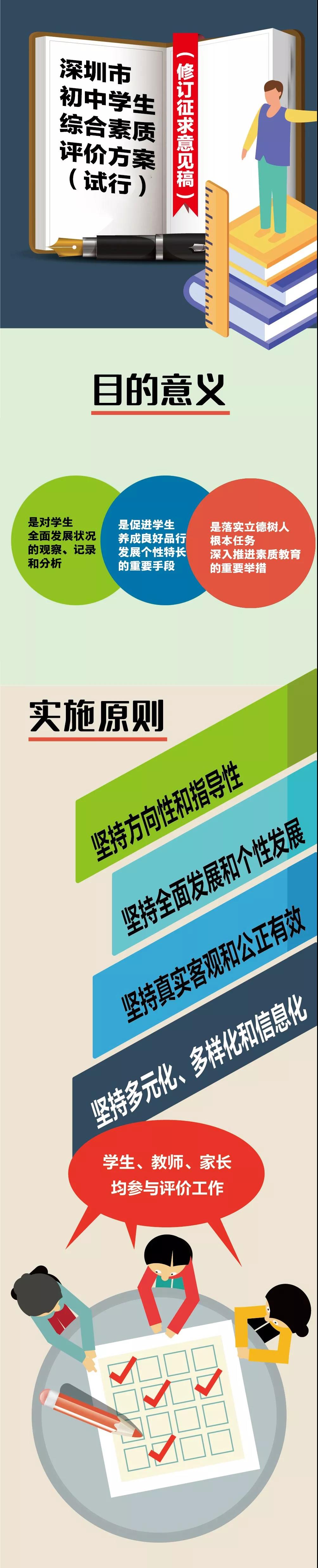 為深入貫徹中共中央、國務(wù)院《關(guān)于深化教育教學(xué)改革全面提高義務(wù)教育質(zhì)量的意見》和《教育部關(guān)于進(jìn)一步推進(jìn)高中階段學(xué)??荚囌猩贫雀母锏闹笇?dǎo)意見》(教基二〔2016〕4號(hào))、《廣東省教育廳關(guān)于實(shí)施初中學(xué)生綜合素質(zhì)評(píng)價(jià)的指導(dǎo)意見(試行)》(粵教基[2018]10號(hào))等文件精神,落實(shí)立德樹人根本任務(wù),“五育并舉”,促進(jìn)學(xué)生的全面發(fā)展和個(gè)性發(fā)展,根據(jù)工作需要,深圳市教育局于2019年12月11日啟動(dòng)了《深圳市初中學(xué)生綜合素質(zhì)評(píng)價(jià)方案(試行)》的修訂工作。在大量調(diào)研論證、多方征求意見的基礎(chǔ)上,形成了《深圳市初中學(xué)生綜合素質(zhì)評(píng)價(jià)方案(試行)(修訂征求意見稿)》。