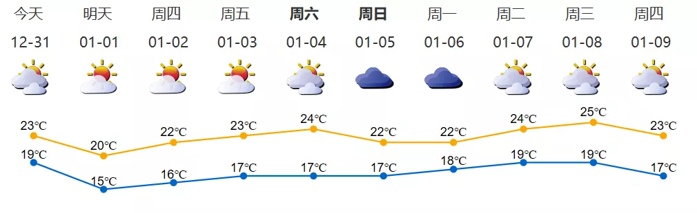 12月31日-1月1日,受冷空氣影響,氣溫下降,1日早晨最低氣溫15℃左右,沿海、高地和海區(qū)最大陣風7級左右,2日多云間晴天,氣溫回升。