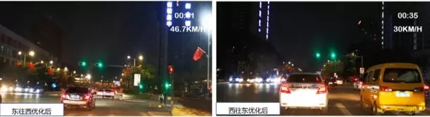 優(yōu)化后,東往西平均車(chē)速穩(wěn)定在43.7KM/H,西往東平均車(chē)速穩(wěn)定于30.5KM/H,且雙向均可不停車(chē)通過(guò)各路口,有效將路口車(chē)速控制于50KM/H以?xún)?nèi),保證路段駕駛體驗(yàn)的同時(shí)提升了路段安全性。