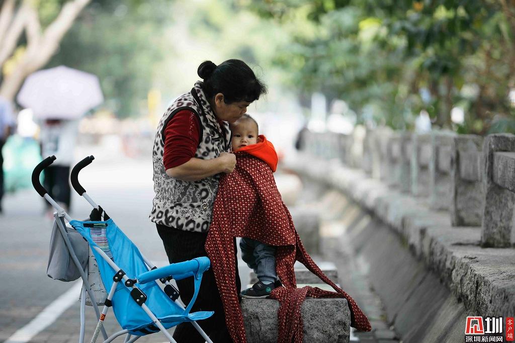 2019年11月19日,深圳福田區(qū),由于氣溫驟降,一位家長(zhǎng)正在為孩子添衣保暖。