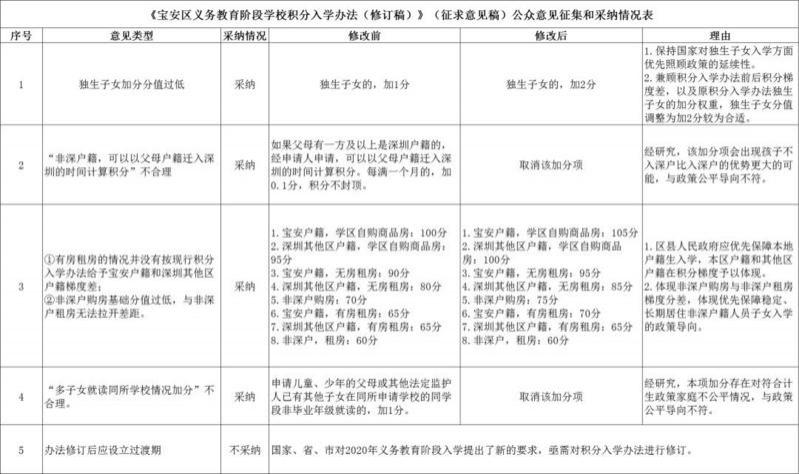 在此次公布的新修訂稿中,對去年12月公布的部分積分計算方式和加分情況進行了重新修訂。主要表現(xiàn)在以下幾個方面:獨生子女加分由1分調整至2分;取消"非深戶籍可以以父母戶籍遷入深圳的時間計算積分"和"多子女就讀同所學校情況加分"兩項加分項;此外,"寶安戶籍,學區(qū)自購商品房""深圳其他區(qū)戶籍,學區(qū)自購商品房""寶安戶籍,無房租房""深圳其他區(qū)戶籍,無房租房""非深戶購房"和"寶安戶籍,有房租房"等情況,分別在原有基礎分上另加5分,"深圳其他區(qū)戶籍,有房租房"和"非深戶租房"分值則保持不變,以體現(xiàn)寶安本區(qū)戶籍與其他區(qū)戶籍、非深戶購房與非深戶租房的積分梯度。