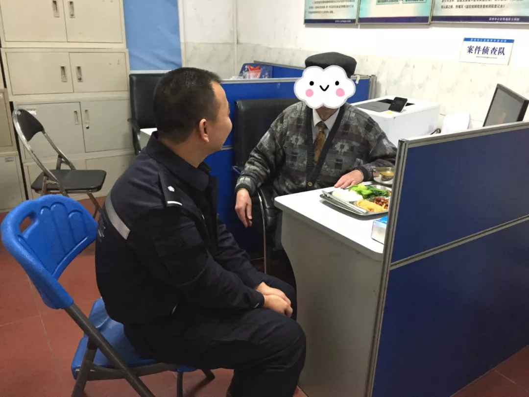 老人與派出所值班民警王研軍講述了自己前來的目的,看見老人一臉疲態(tài),王研軍立即安排地方給老人休息,并安排輔警吳海明供應(yīng)午餐給老人食用。