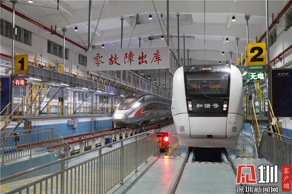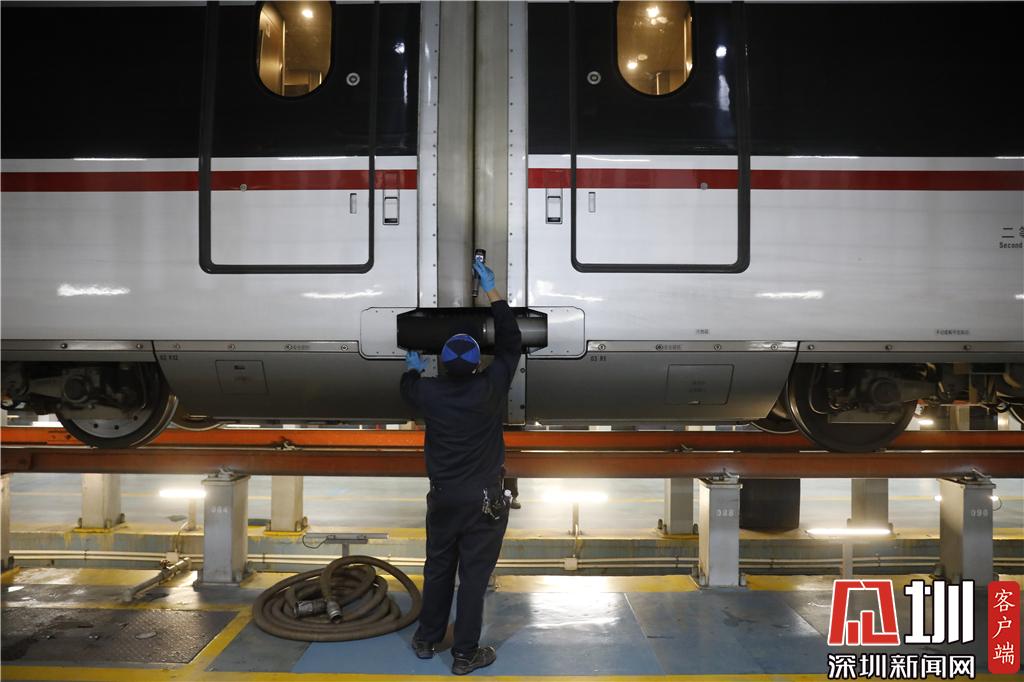 據(jù)悉,深圳動(dòng)車運(yùn)用所平日里主要承擔(dān)著動(dòng)車組的運(yùn)用檢修任務(wù),這里是一列列動(dòng)車的“醫(yī)院”。白天日行千里的列車,深夜都要回到這里“體檢”,確認(rèn)“零故障”后才能繼續(xù)上路運(yùn)行。深圳動(dòng)車運(yùn)用所擁有6條檢車線共12個(gè)列位,每天夜里至次日凌晨是這里最忙碌的時(shí)候,春運(yùn)期間,每晚都會(huì)有二三十輛“下班”動(dòng)車上線待檢,完成一輛動(dòng)車的平均檢修時(shí)間是3個(gè)小時(shí),相較于平時(shí),春運(yùn)期間,深圳動(dòng)車運(yùn)用所檢修工人的工人增加了一倍。