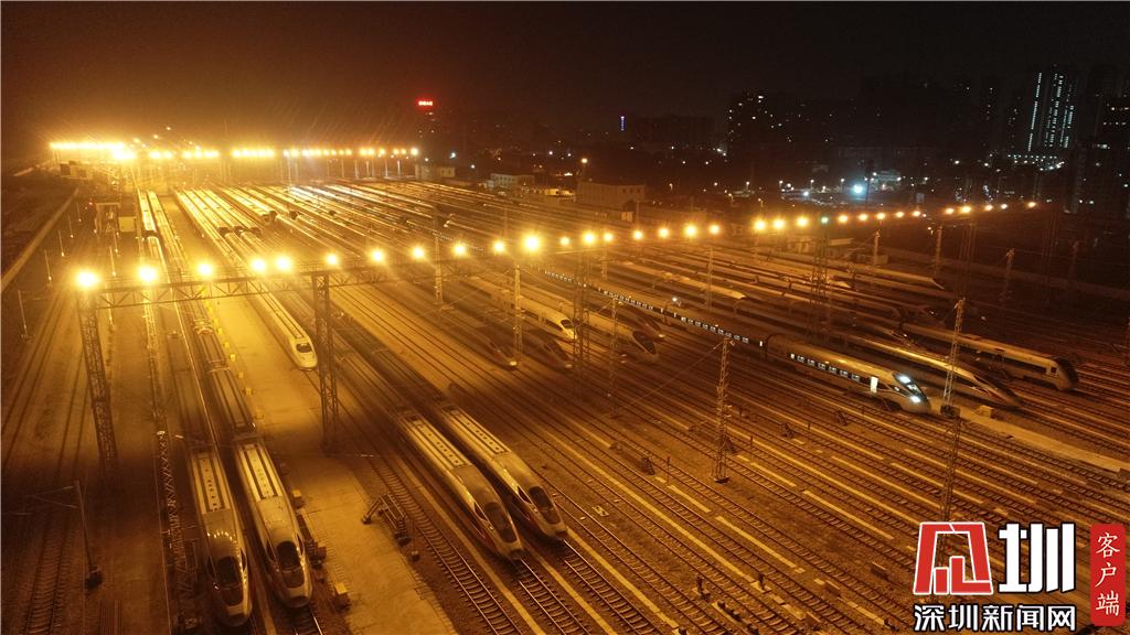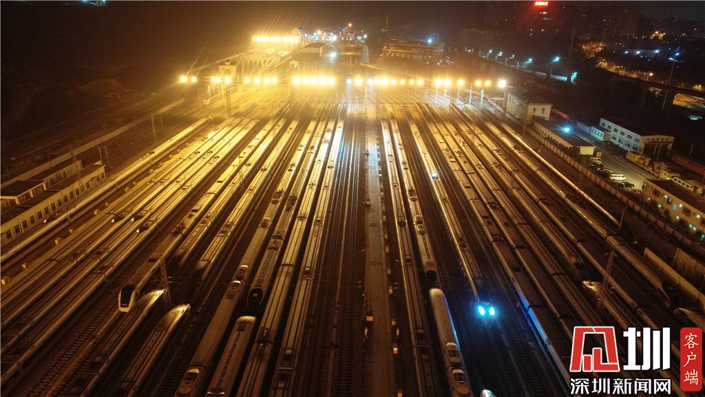 1月15日凌晨,深圳動(dòng)車運(yùn)用所內(nèi)的存車庫(kù)航拍畫面。