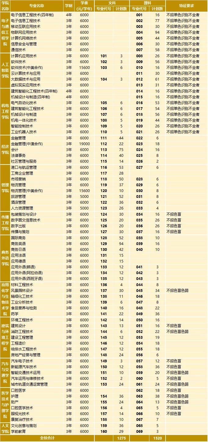 ②以下各招生專業(yè)、專業(yè)代號、計(jì)劃數(shù)、選報(bào)證書、特征要求等及其它備注以廣東省招生辦公布的專業(yè)目錄為準(zhǔn);