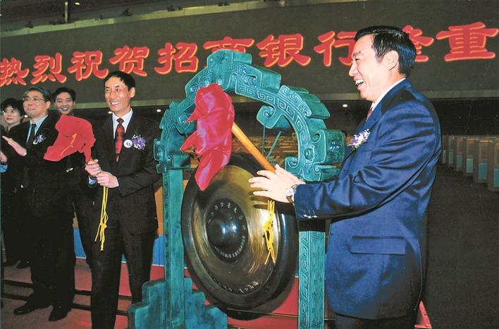 ▲2002年,招行在深交所掛牌上市,馬蔚華(右一)在敲鐘。