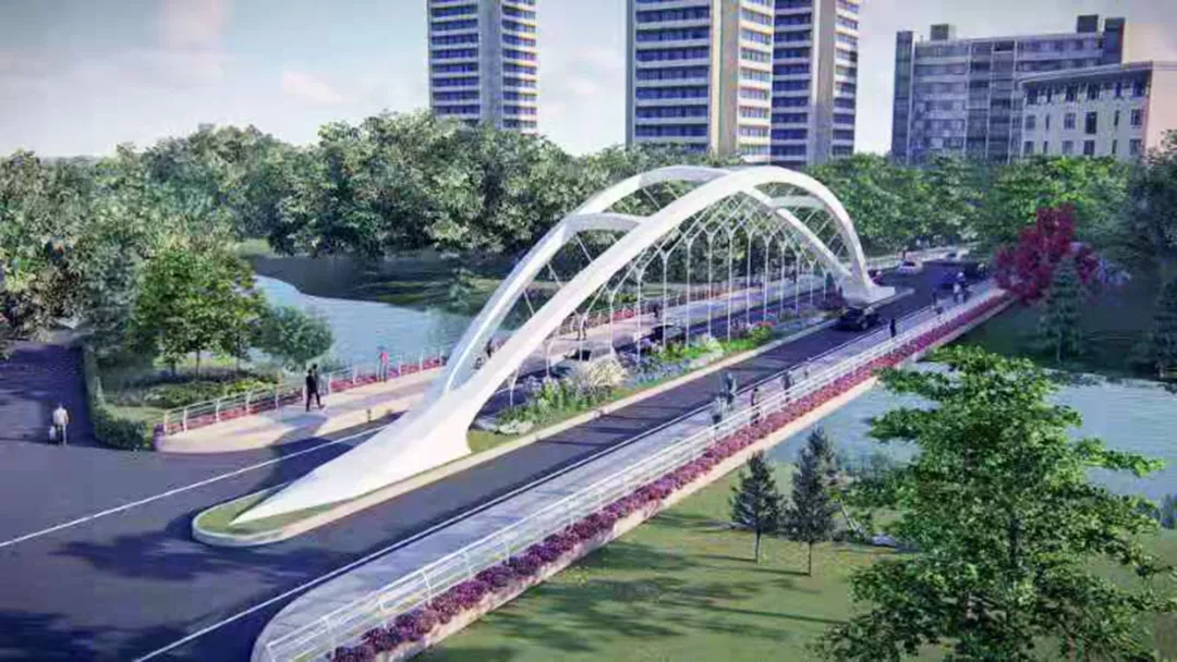 據(jù)介紹,凌菊路跨大沙河橋主體結(jié)構(gòu)需與大沙河生態(tài)長廊同步建設(shè),項目工期緊、任務重。根據(jù)相關(guān)規(guī)定,橋梁在河中不能設(shè)支墩,與大沙河河道需滿足2.5m的凈高要求,橋梁跨度大。最終,該項目采用下承式拱結(jié)構(gòu)鋼橋,鋼結(jié)構(gòu)橋梁可在工廠提前預制,運輸至現(xiàn)場安裝,解決了技術(shù)和工期緊等難題。