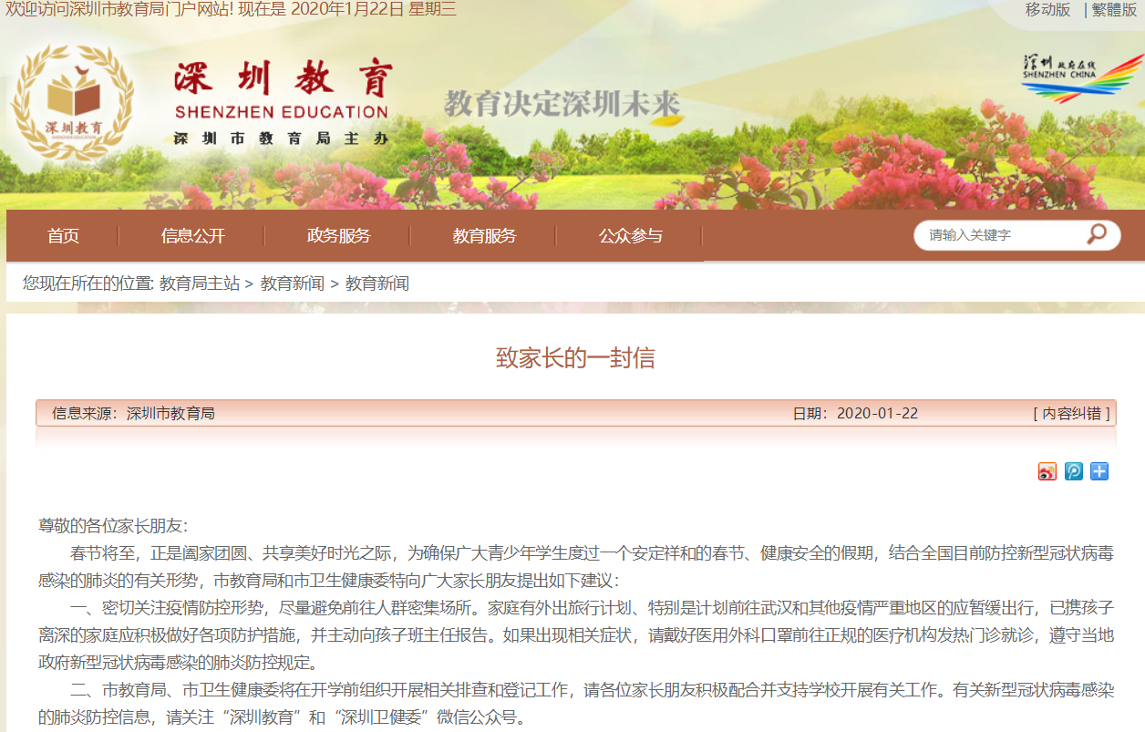 見圳客戶端·深圳新聞網(wǎng)2020年1月22日訊 1月22日,市教育局下發(fā)《深圳市教育系統(tǒng)新型冠狀病毒感染的肺炎疫情防控工作方案》的通知,引導師生假期盡量不要前往武漢和疫情嚴重地區(qū),并要求校外培訓機構即日起全面停止春節(jié)假期補課。