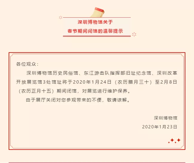 深圳博物館歷史民俗館、東江游擊隊指揮部舊址紀(jì)念館、深圳改革開放展覽館3處館址將于2020年1月24日(農(nóng)歷臘月三十)至2月8日(農(nóng)歷正月十五)期間閉館,對展覽進(jìn)行維護(hù)保養(yǎng)。由于展廳關(guān)閉對您參觀帶來的不便,敬請諒解。