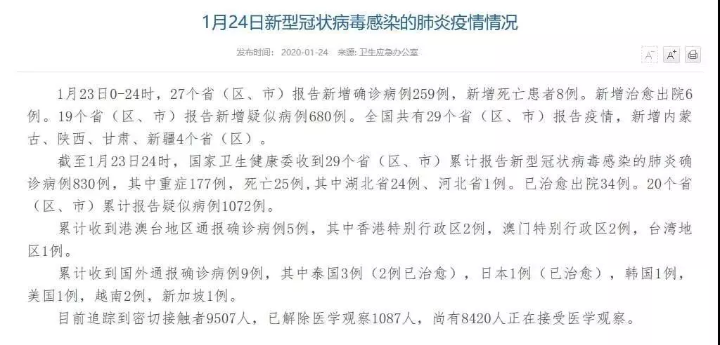 國家衛(wèi)建委通報:1月23日0-24時,27個省(區(qū)、市)報告新增確診病例259例,新增死亡患者8例。新增治愈出院6例。19個?。▍^(qū)、市)報告新增疑似病例680例。全國共有29個?。▍^(qū)、市)報告疫情,新增內(nèi)蒙古、陜西、甘肅、新疆4個?。▍^(qū))。
