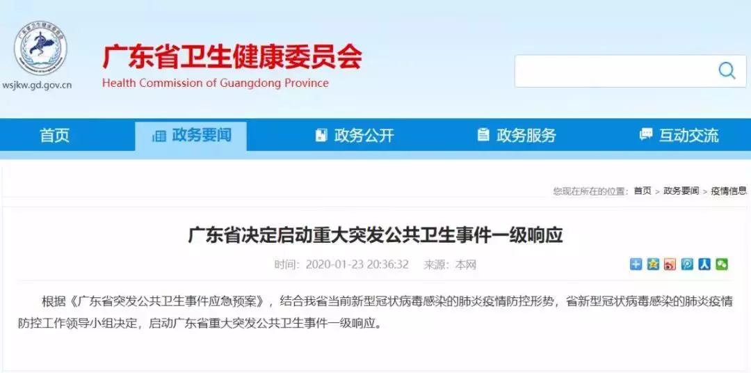 廣東省衛(wèi)健委1月23日晚發(fā)布通告:根據(jù)《廣東省突發(fā)公共衛(wèi)生事件應(yīng)急預(yù)案》,結(jié)合我省當(dāng)前新型冠狀病毒感染的肺炎疫情防控形勢,省新型冠狀病毒感染的肺炎疫情防控工作領(lǐng)導(dǎo)小組決定,啟動廣東省重大突發(fā)公共衛(wèi)生事件一級響應(yīng)。