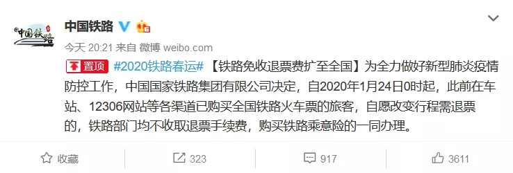 【鐵路免收退票費(fèi)擴(kuò)至全國】為全力做好新型肺炎疫情防控工作,中國國家鐵路集團(tuán)有限公司決定,自2020年1月24日0時起,此前在車站、12306網(wǎng)站等各渠道已購買全國鐵路火車票的旅客,自愿改變行程需退票的,鐵路部門均不收取退票手續(xù)費(fèi),購買鐵路乘意險的一同辦理。