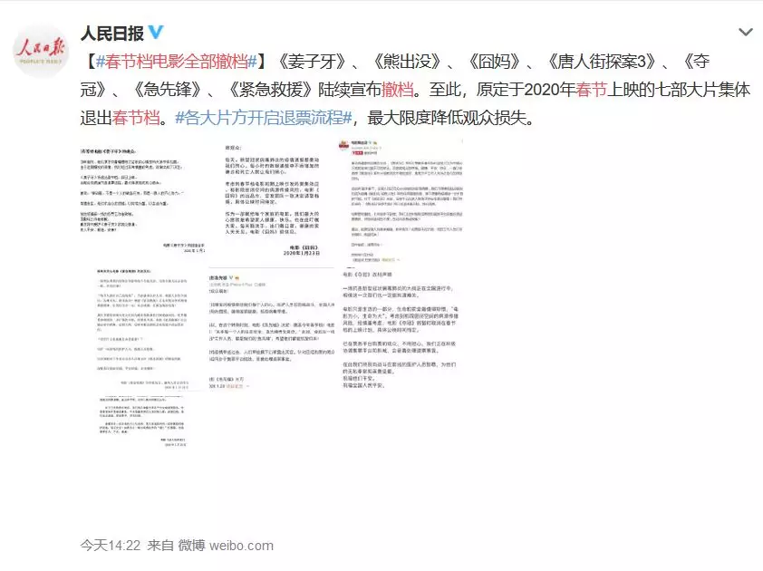 因“擔(dān)憂疫情進(jìn)一步擴(kuò)散”、“考慮影院密閉空間的病源傳播風(fēng)險”等因素,23日,2020春節(jié)檔的七部影片《唐人街探案3》《囧媽》《奪冠》《緊急救援》《姜子牙》《熊出沒·狂野大陸》《急先鋒》集體宣布撤檔,均將擇日再映。各大片方開啟退票流程,最大限度降低觀眾損失。