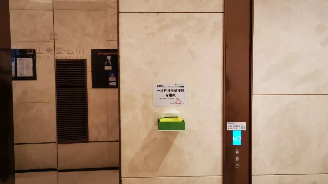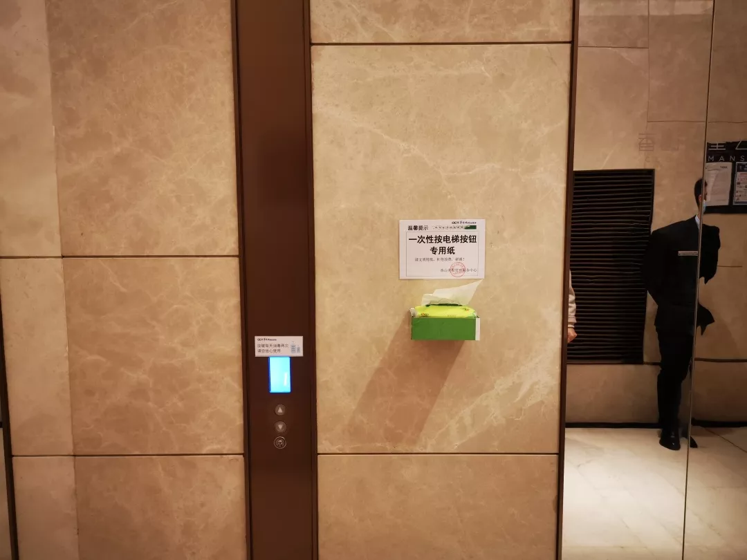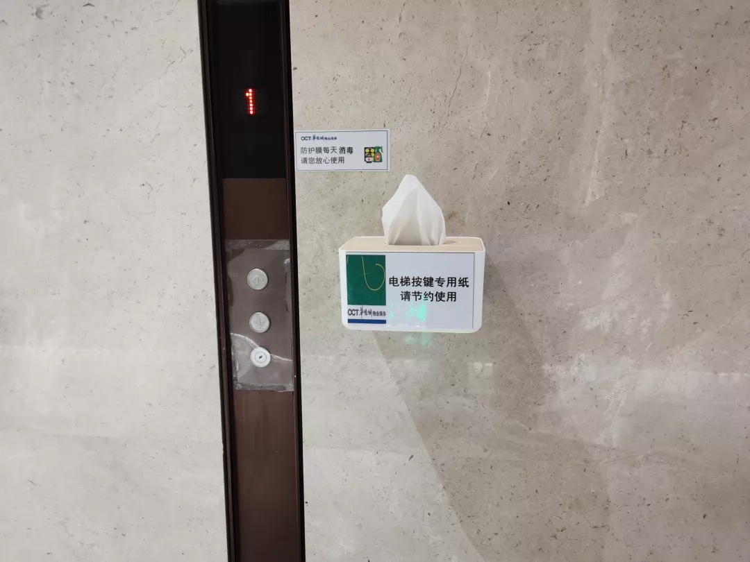 考慮到防控形勢需要,中心對電梯間及按鈕每天至少不低于2次消毒、且每天更換保鮮貼膜外,又于31日在各個(gè)電梯廳增設(shè)了一次性抽紙,供乘坐電梯按電梯按鈕時(shí)取用。(注:部分樓棟、明天陸續(xù)增設(shè)到位)