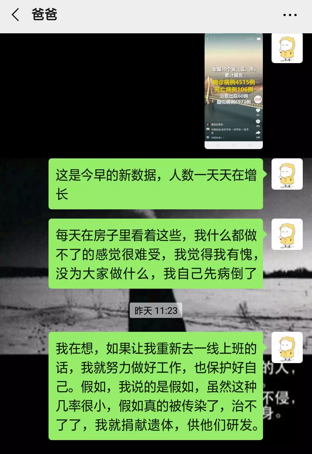 高強(qiáng)度的密閉性工作,李生蘭病倒了,病床上她依然數(shù)次“請戰(zhàn)”。在發(fā)給爸爸的微信中,她寫道,“假如我倒在了崗位上,請捐獻(xiàn)我的遺體!”把我的遺體捐獻(xiàn),我希望能為這次疫情做點(diǎn)什么!