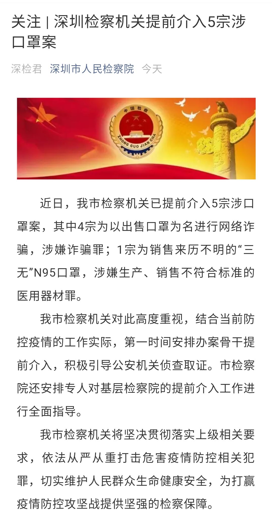深圳檢察機(jī)關(guān)提前介入5宗涉口罩案 涉及詐騙和銷售三無產(chǎn)品